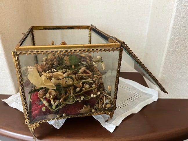 ワックスフラワーやリボンでできていますが、触ると崩壊してしまいそうです。