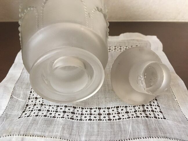 ラリックの「Perlesペルル」です。ネックレスのように優雅に下がったパールの香水瓶です。ストッパーの内側になる部分にあたりがあります。ふたをすると見えない部分です。