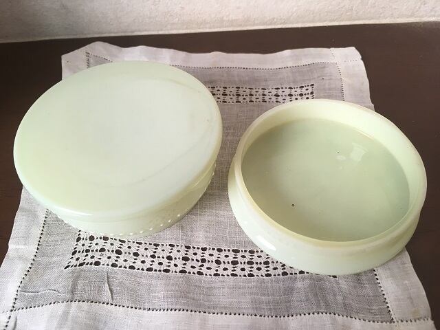オパリンガラスのクリームケースです。IST-0002とおそろいのものです。うっすらとウランガラスのようです。
