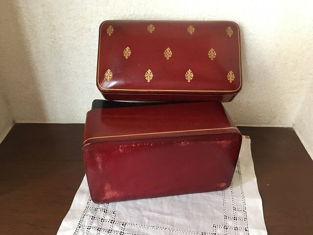 トランプを2組入れるための革製のケースです。 ふたには金彩が施されていて、丸みもついていてとても素敵です。内側の状態もとてもいいです。20世紀初頭~半ば。