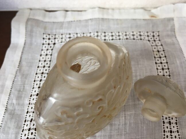 ブルジョアの「コバコ(KOBAKO)」という香水瓶です。日本語の小箱のことなのだと思いますが、またしても日本風というより中国風です。向こう側から光に透かすと浮彫がとても美しいです。