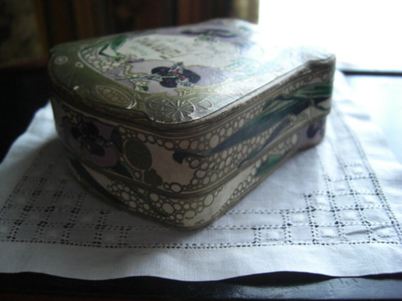 このパウダーケースはフランスの老舗L.T. Piverのフェイスパウダーが入っていたものです。先日、ミュゲのムエットを入手した際に、お店の人と「やっぱりピヴェールはヌーボーなイメージですね」などと話しました。元々の香水の発売は1895年です。この箱も1910年代ぐらいのものだと思います。10×8.5×高さ3.5