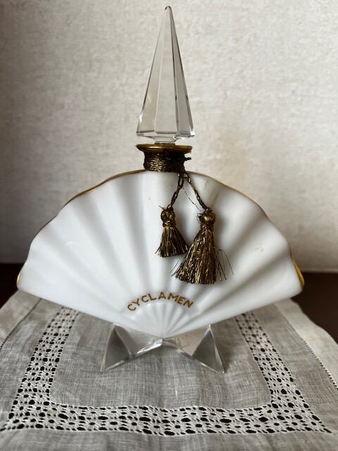 エリザベスアーデンの香水瓶「シクラメン」です。 ガラスはバカラ社製。扇の形豪華なボトルです。 足の部分一か所に小さなあたりがあります。 1938年、高さ約13センチ。